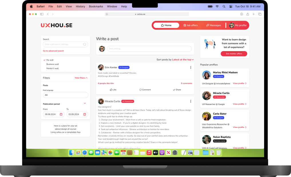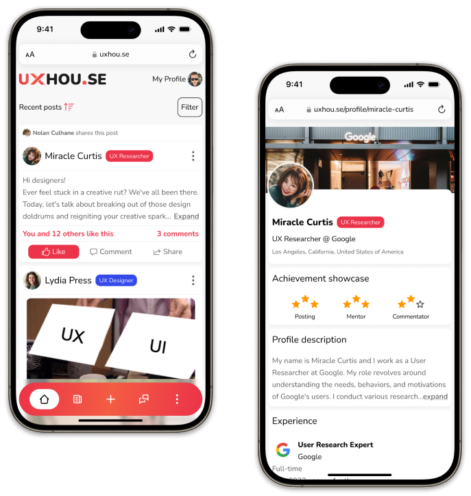 On UXhouse, there will be opportunities to publish posts, comment on other users' posts and exchange knowledge about UX. Whether you have a question about interface design best practices or want to share your latest project, everyone is here to support you.