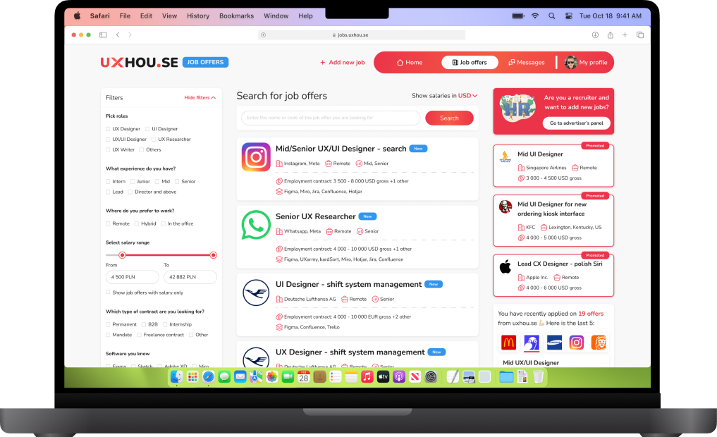 Totalnie świetne! Już nie musisz przebijać się przez setki ofert, które kompletnie cię nie interesują. Wszystko skrojone pod Ciebie, od UI designu po research – w jednym miejscu, bez zbędnych zapychaczy. Robisz ilustracje, branding, a może znajmujesz się UX writingiem? Przfiltruj oferty pracy według własnych preferencji! Tylko design, żadnych kompromisów. To jak Netflix dla designerów – scrollujesz, wybierasz, działasz!